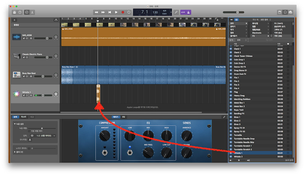 효과음도 마찬가지로, 루프 브라우저에서 알맞은 효과음을 찾은 후, 트랙 영역으로 드래그&드롭 하면 됩니다. 물론, 동영상에서 어떤 부분에서 해당 효과음이 나타나게 해야 할지 위치를 잘 보고 넣어주어야 합니다!