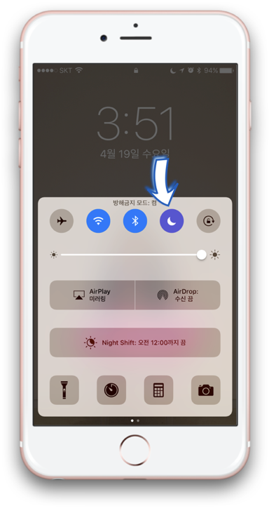 사용하는 방법은 간단합니다. 제어센터를 불러서 초승달 모양의 버튼을 눌러주면 끝. 그러면 보라색 버튼으로 바뀌며 기능이 활성화됩니다. 화면 제일 위에 메뉴바에서도 초승달 모양이 표시되는데 해제하고 싶을 때는 다시 눌러서 꺼주시면 됩니다.