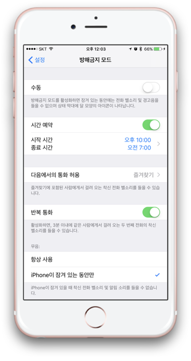 [다음에서의 통화 허용] : 방해 금지 모드가 활성화되어도 전화 연결이 바로 될 수 있는 전화 목록을 지정할 수 있습니다.