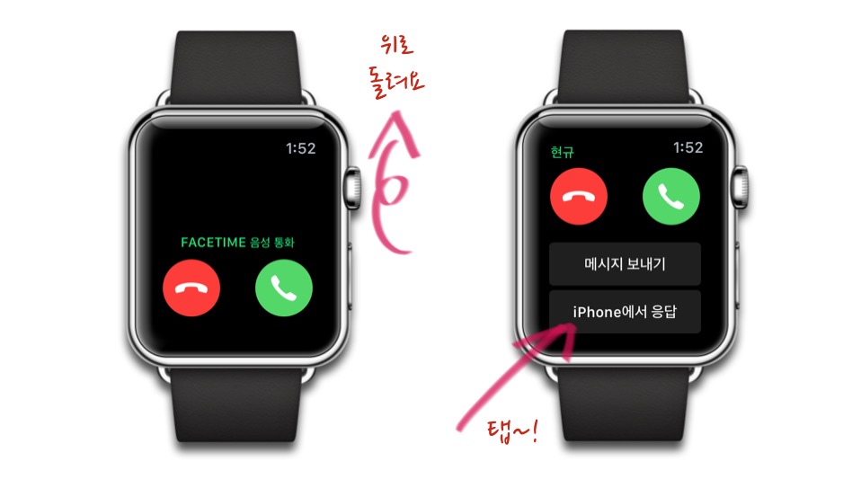 그럴 땐, 애플 워치 옆에 있는 크라운을 위로 올려보세요. ‘iPhone에서 응답’ 버튼을 누르면, 아이폰에서 통화 할 수 있습니다.