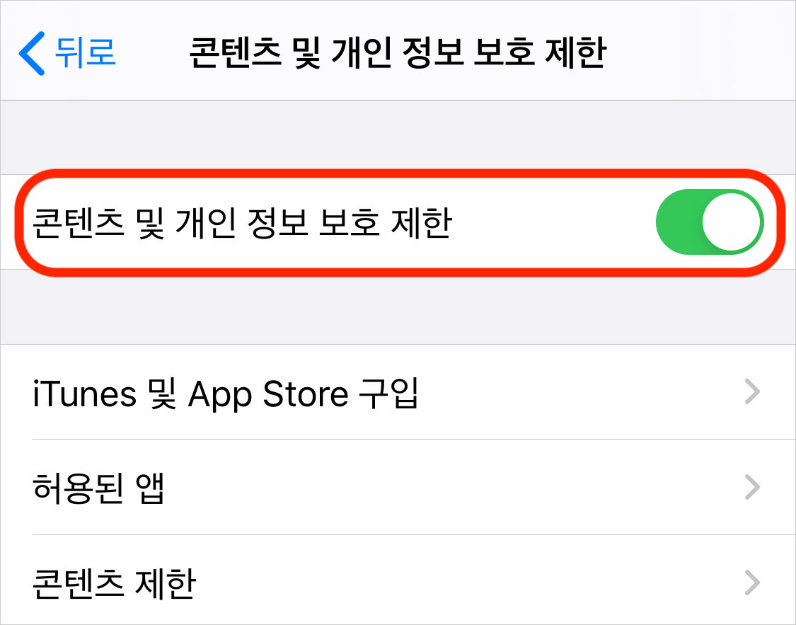 설정 > 스크린 타임 > (가족 카테고리의) 자녀 계정 > 콘텐츠 및 개인 정보 보호 제한에서 '콘텐츠 및 개인 정보 보호 제한'을 켜줍니다.