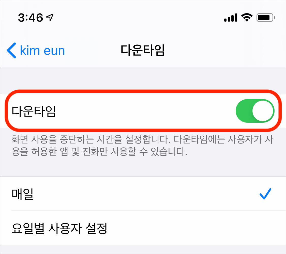 그런데 이렇게 다운타임을 설정하면 자녀는 뭐라고 할까요? "엄마, 나 영어 사전 앱 써야 하니 차단 풀어주세요!"라고 할 수 있겠죠? 그러면 부모 입장에서는 공부한다니 어쩔 수 없이 다운타임을 해제할 수밖에 없습니다.