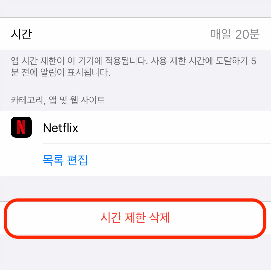 Netflix 시간 제한을 해제하려면 '시간 제한'에 있는 Netflix를 다시 탭하고 '시간 제한 삭제'를 탭하세요.