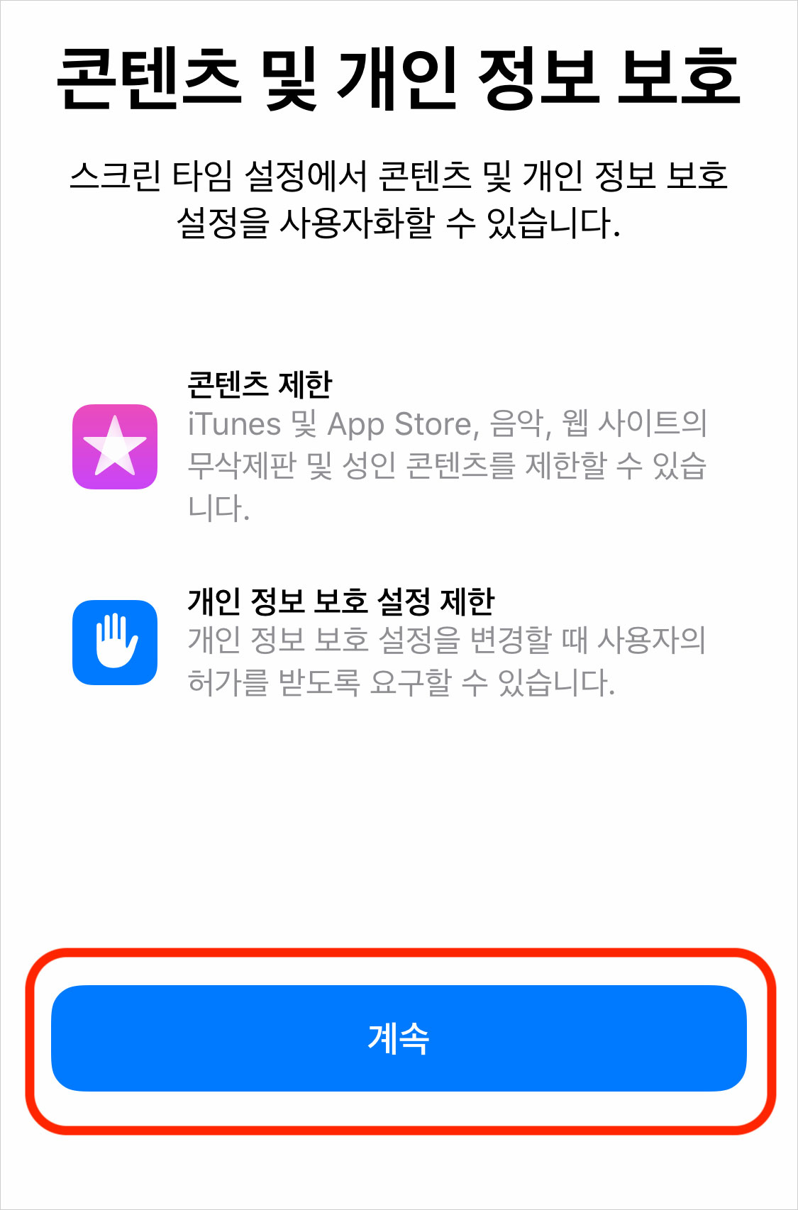 콘텐츠 및 개인 정보 보호에서 '계속'을 탭합니다.