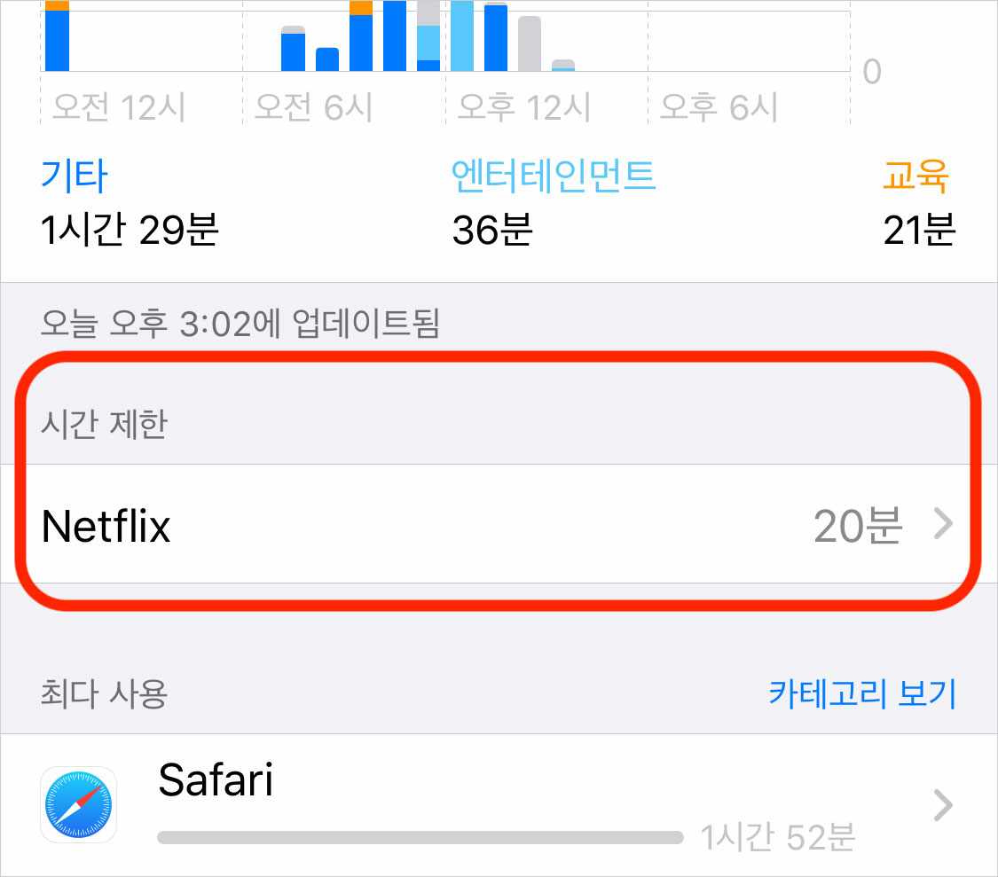 예를 들어 시도 때도 없이 Netflix를 너무 많이 사용한다면 '최다 사용' 부분에 Netflix가 표시될 텐데요. Netflix를 탭하고 일별, 또는 시간별 사용량을 확인하세요. 그리고 아래 '시간 제한 추가'를 탭합니다.
