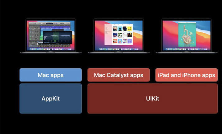 물론 아이폰/ 아이패드와 맥은 접근 가능한 하드웨어, 센서, 화면 크기 등에서 큰 차이를 보이고 동화되기 어려운 점은 분명히 있지만, WWDC 기조연설 슬라이드에서 보면 macOS Big Sur에서는 UIKit을 확장하는 형태로 macOS, iOS 사이에 호환 레이어가 구현되는 걸 알 수 있습니다.