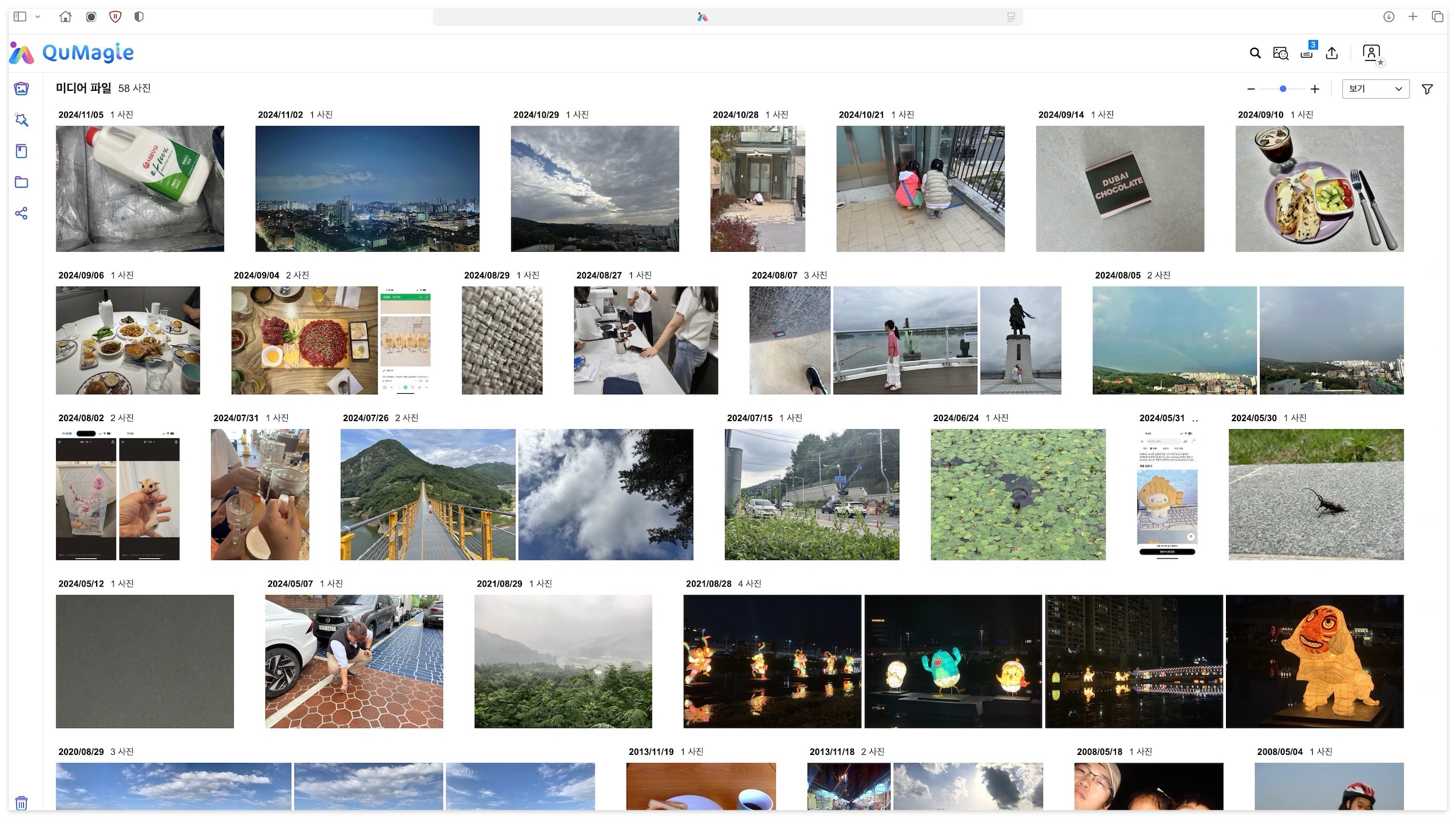 큐매지를 처음 실행하니 메인 화면에서는 최근 추가된 사진이 썸네일 형태로 보이며, 상단 메뉴에서 얼굴, 사물, 장소, 태그로 구분된 카테고리에 접근할 수 있습니다. 그래서 일일이 정리하지 않고도 필요한 사진을 빠르게 찾을 수 있습니다.