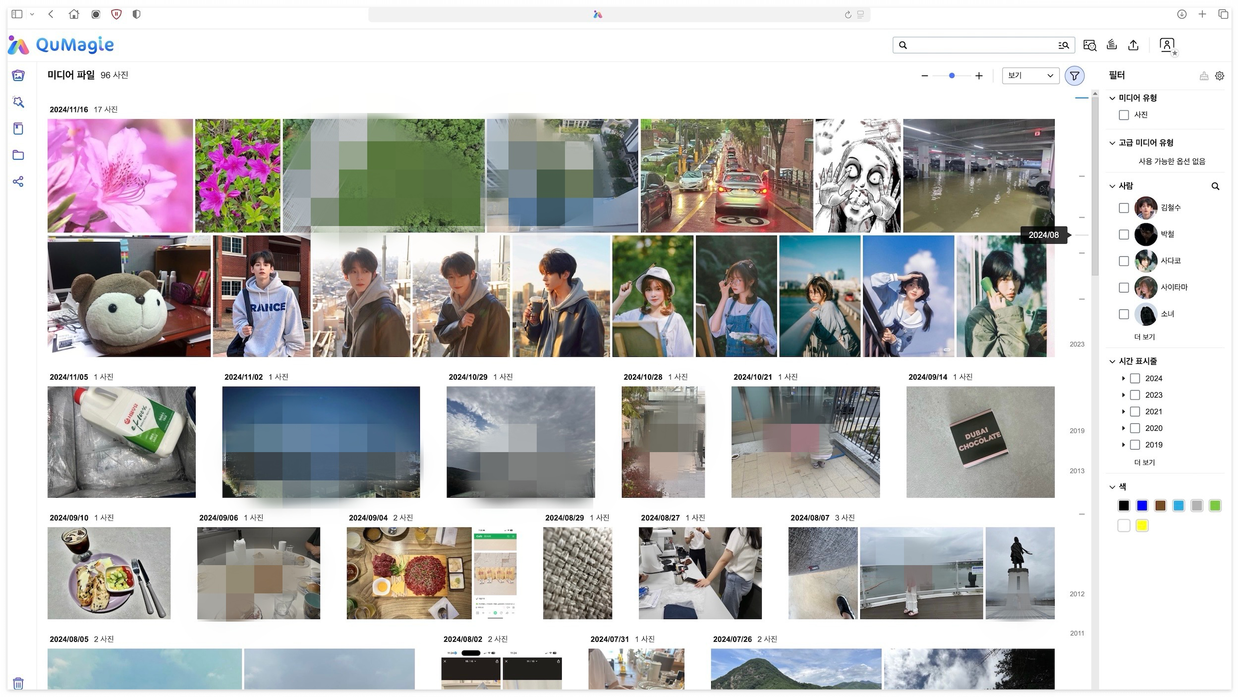 특정 사람을 선택하면 해당 인물의 얼굴이 포함된 모든 사진을 자동으로 필터링하여 보여주며, 그 결과를 연도별, 월별로 정렬할 수도 있습니다. 처음 만져보는데 UI가 다른 관리 앱과 비교해도 완전히 이질적이거나 한 게 아니니 손에 금방 익었습니다.