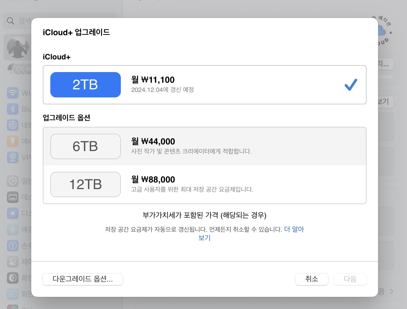 클라우드 서비스는 매월 구독료를 내고 쓰고 있습니다. 저는 아이클라우드 2TB를 사용하고 있지만, 만약 다음 용량인 6TB로 업그레이드하려면 매달 약 44,000원 요금을 내야 합니다. 클라우드를 사용할 때는 용량이 커질수록 비용이 증가하기 때문에, 상황에 따라 데이터를 분산 저장하거나, 더 많은 용량이 필요로 할 경우 차라리 NAS가 나을 수 있습니다. 클라우드 서비스는 고민 없이 결제만 하면 되는 데 비용 아끼려 여러 서비스를 쓰려고 머리 굴리다 보면 더 피곤해집니다.