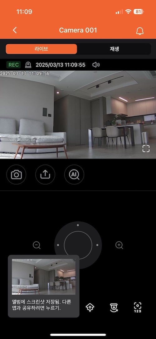 NAS에 홈캠을 연동해서 써본 건 처음인데 이전엔 외부에서 집 안을 둘러볼 때는 로봇청소기 홈패트롤 기능을 사용했습니다. 근데 로청에 부가적으로 달린 기능이다 보니 화질도 좋지 않았고 화면 색감도 실제와 달랐습니다. 무엇보다 로청이 집 구석에 있다 보니 거실을 보려면 원격으로 조종해야 했는데 반응성이 심하게 느렸고 거리감이 체감 안 되어 장애물 피해 움직이기란 쉽지 않더라고요.